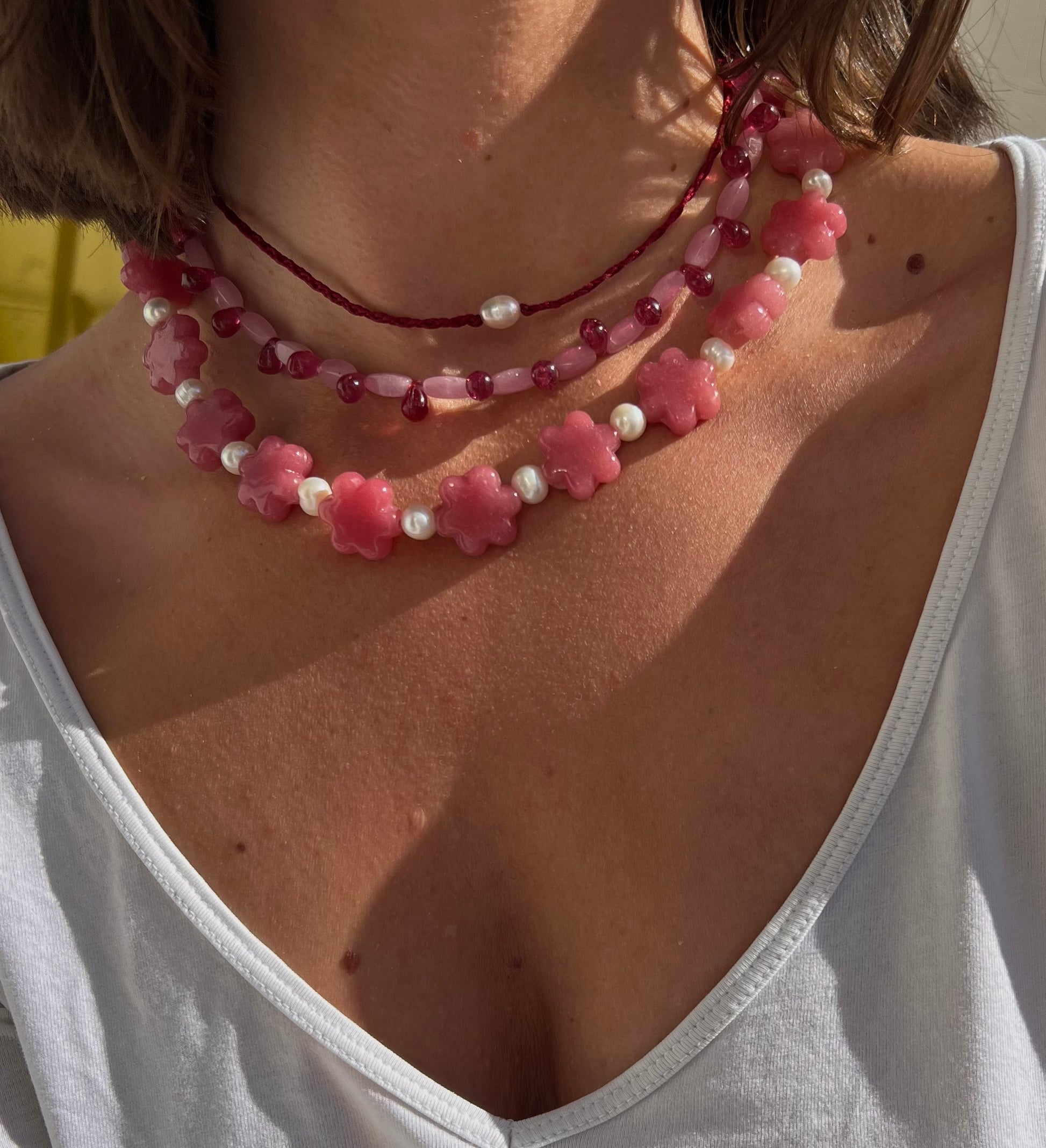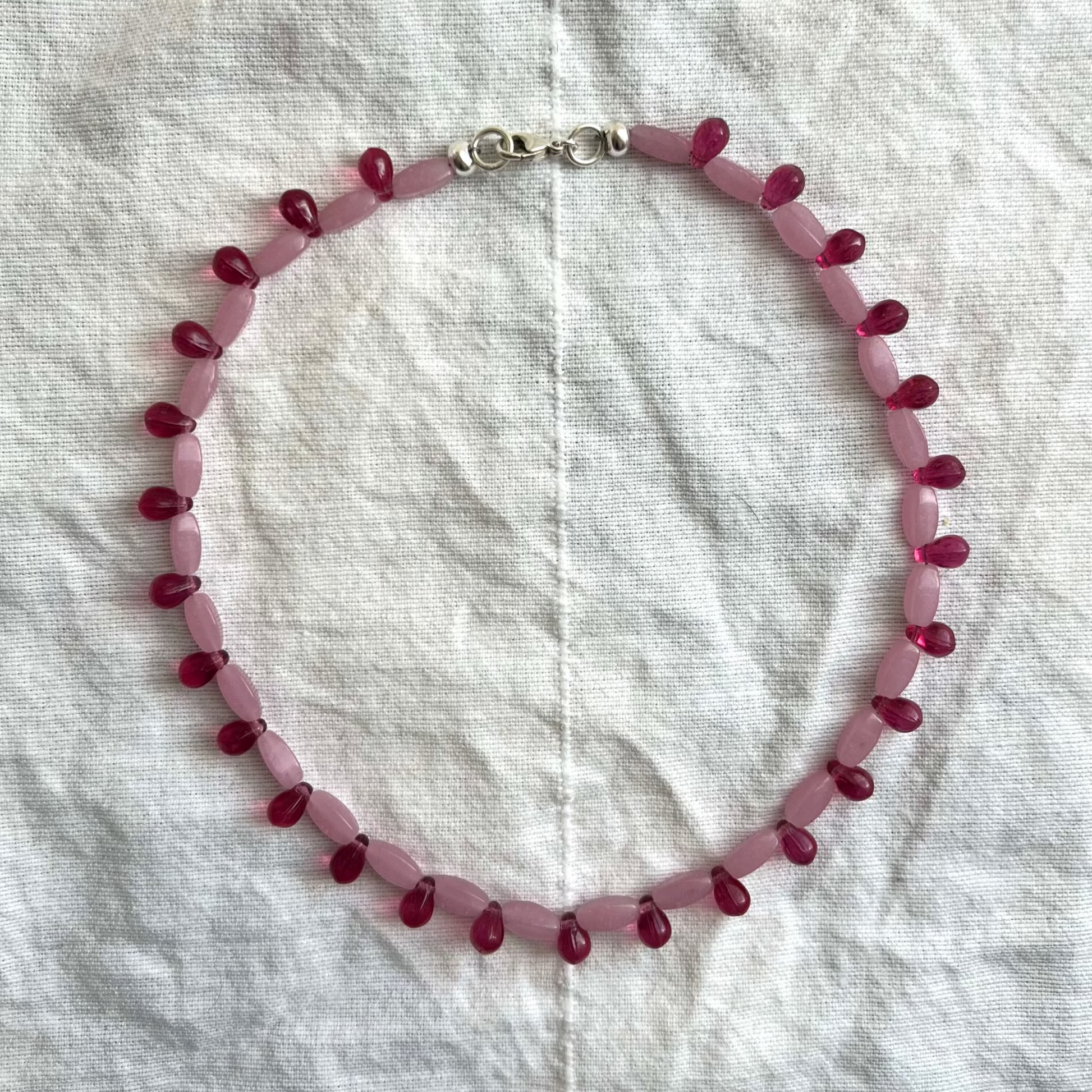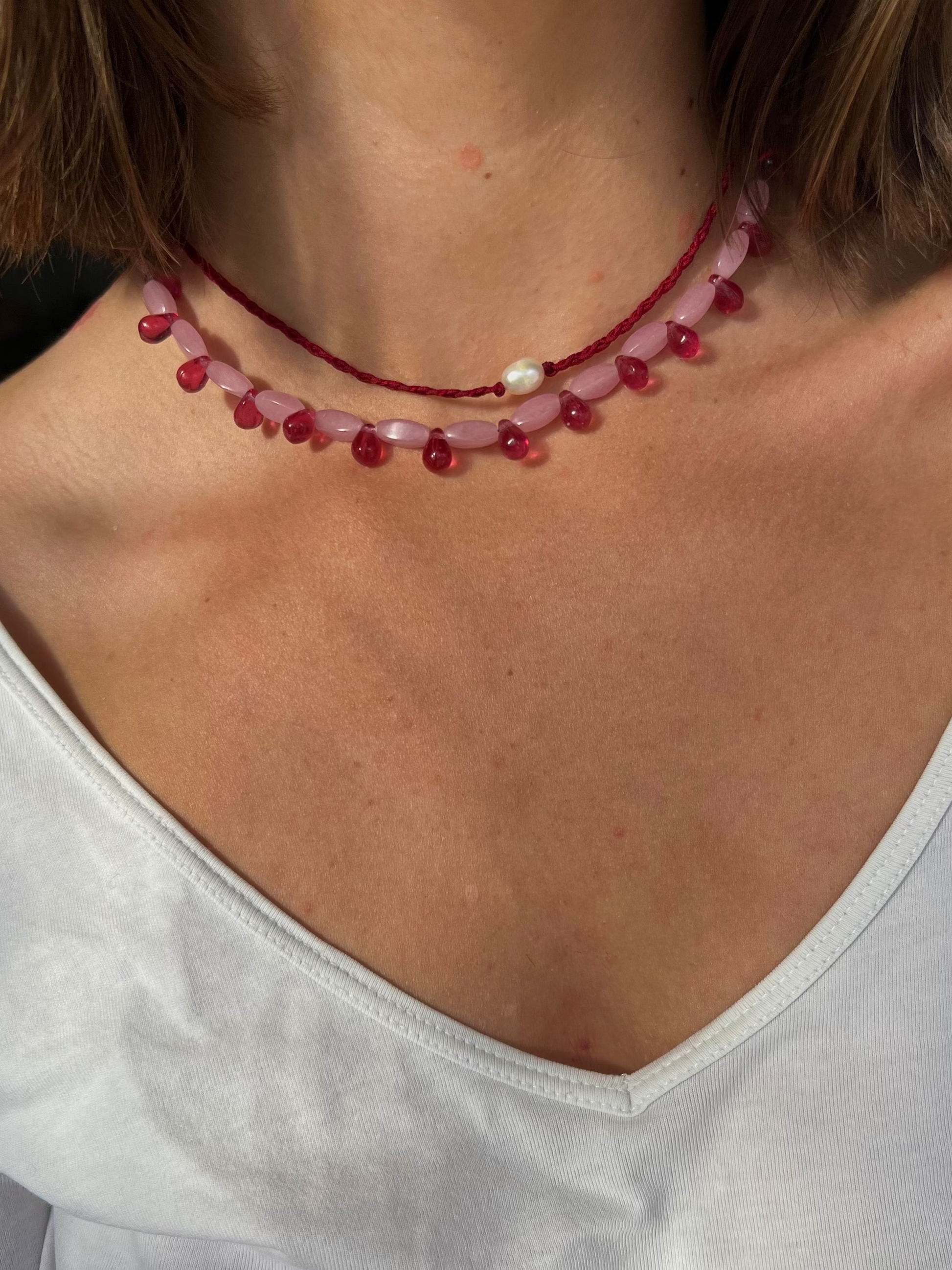 Die NORA Kette ist aus kleinen ovalen und tropfenförmigen Glasperlen, die sich ganz Zart an deinen Hals schmiegt - in Kombination mit anderen Ketten oder ganz simpel alleinstehend.