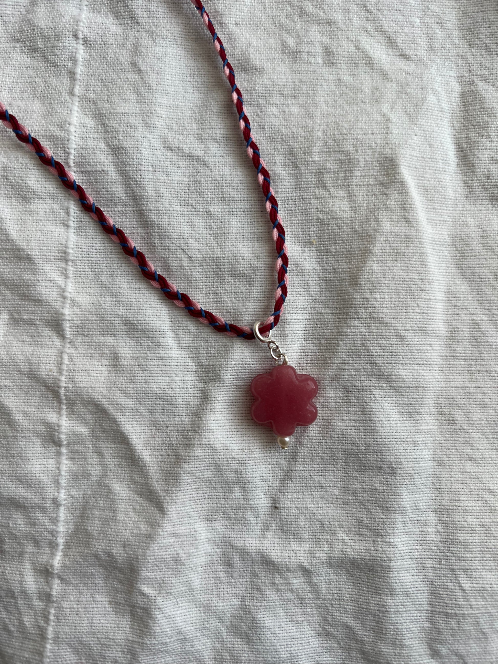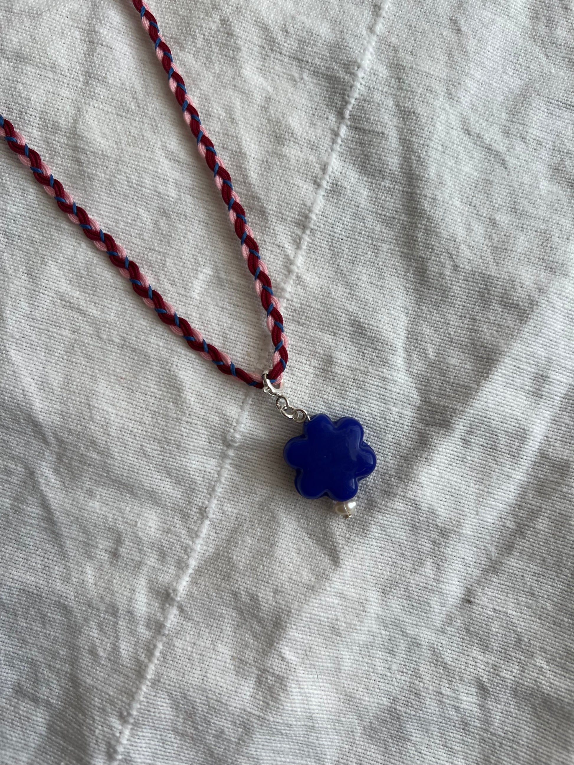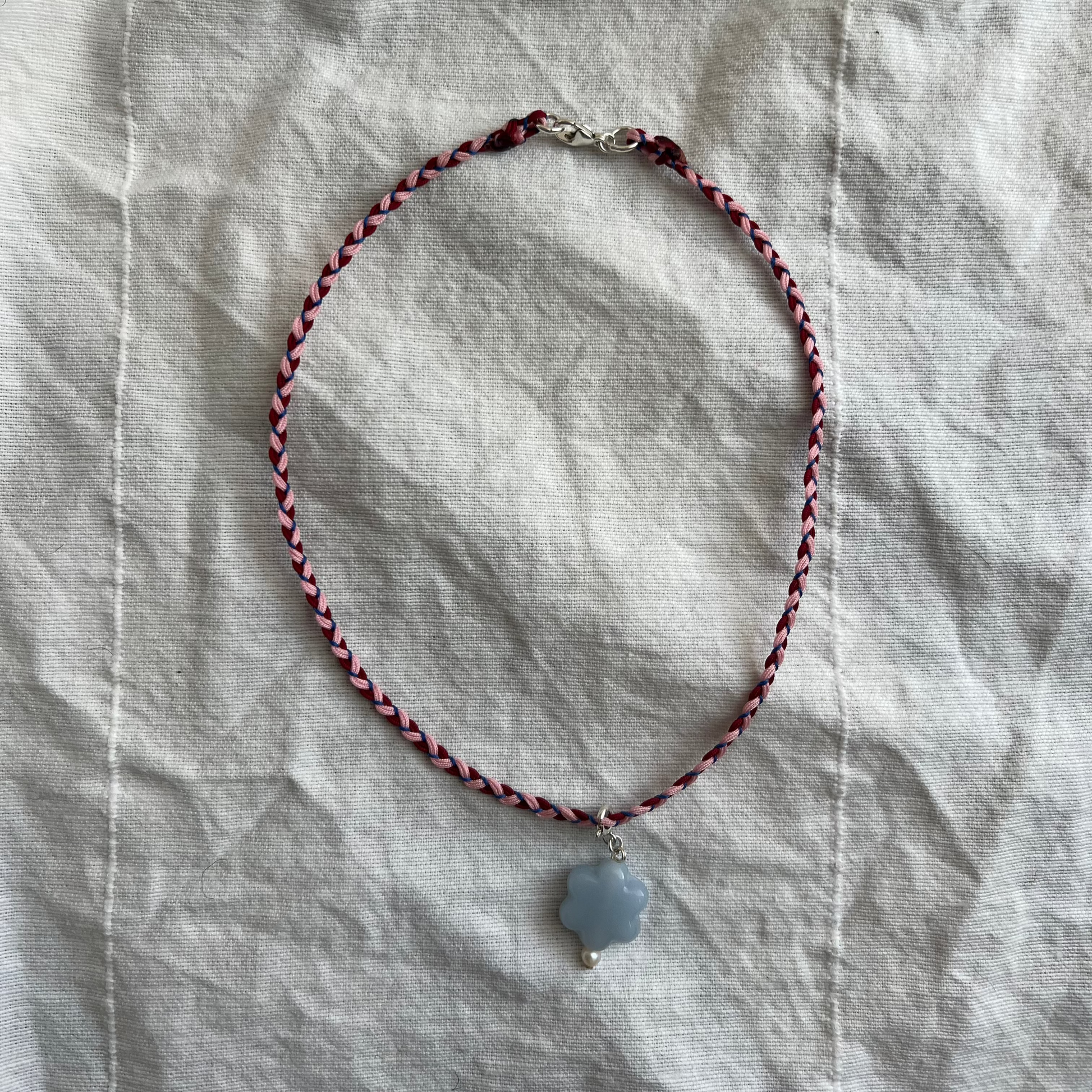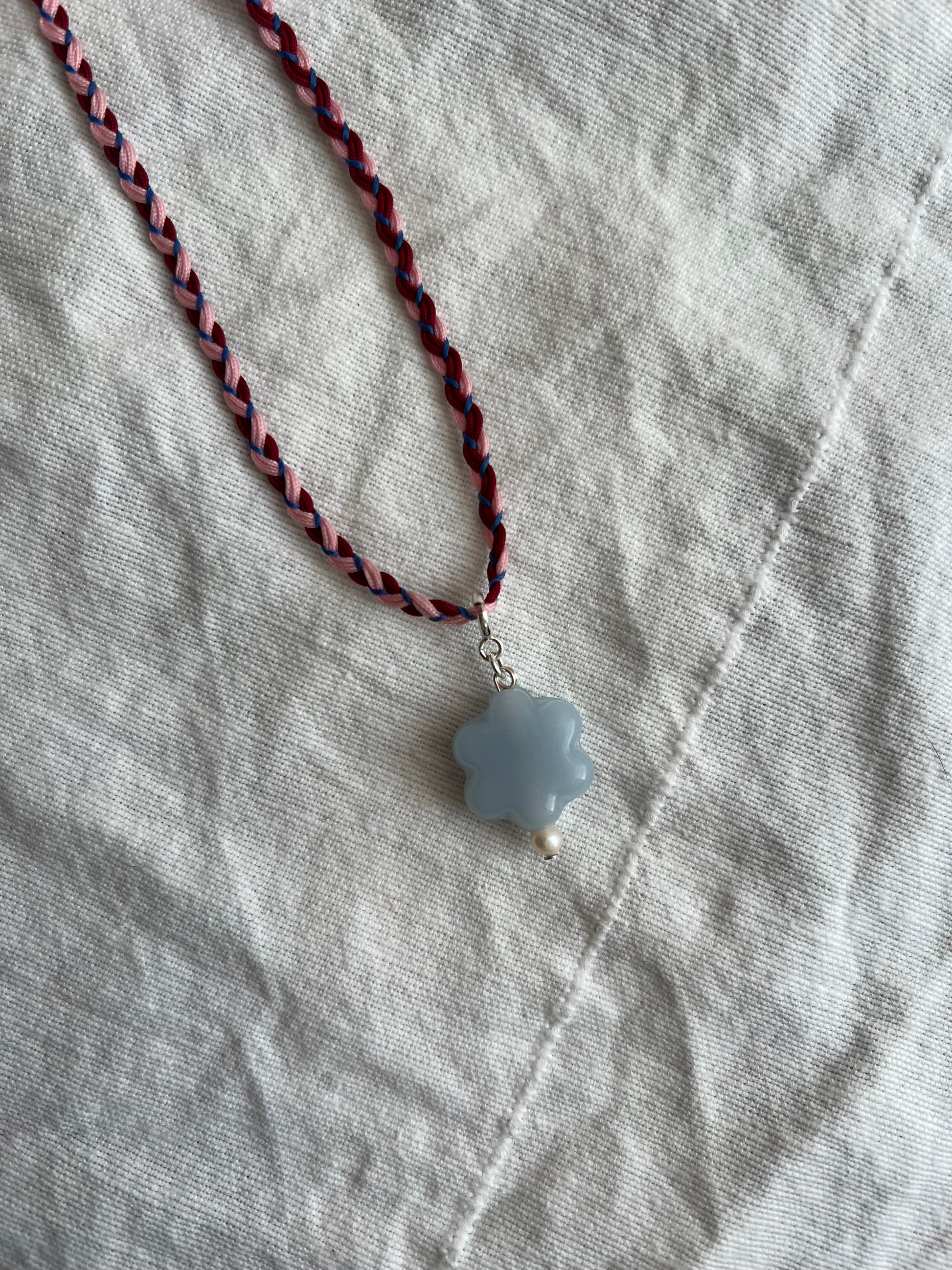Die Kette ist ein absoluter Hingucker! Ein dickeres Hand geflochtenes Band mit einem Glasanhänger und echter Süßwasserperle